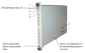 Фотография внешнего вида RFS VXI приведена на рисунке 1. На передней панели модуля находятся индикаторы и разъемы выходных сигналов, места для размещения обозначения типа СИ, знака утверждения типа. Места для размещения наклеек для пломбировки от несанкционированного доступа расположены на винтах крепления боковых крышек модуля..