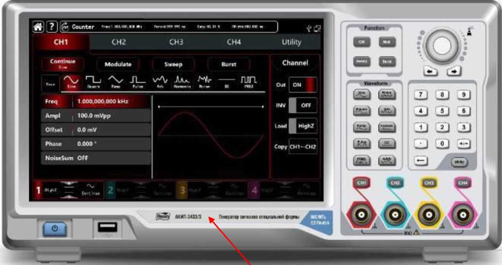 На передней панели генератора расположена кнопка включения питания, USB интерфейс, в нижней части панели расположены выходные разъемы четырех основных каналов с кнопками переключения текущего канала на экране. Выходные каналы полностью независимы и позволяют производить отдельную настройку частотных и амплитудных параметров по каждому из каналов.