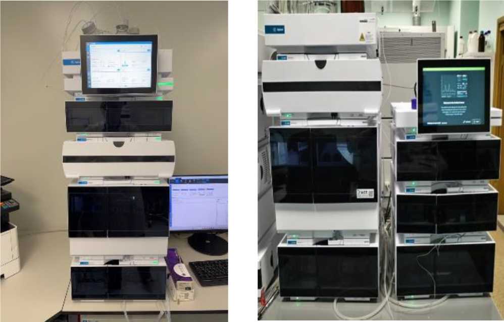 В состав хроматографов входят детектор(ы) на диодной матрице 1260 DAD WR и 1260 DAD HS, детектор флуориметрический 1260 FLD, рефрактометрический 1260 RID, насос четырехканальный высокого давления 1260 Quat Pump, автосамплер 1260 Vialsampler, термостат колонок 1260 MCT.