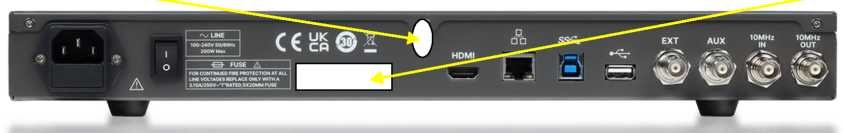 На задней панели расположены: разъем сети питания, разъем для дистанционного управления USBTMC, разъем USB 2.0, LAN-разъем, вход и выход опорного генератора, дополнительные функциональные входы/выходы, видео выход HDMI для подключения внешнего монитора.
