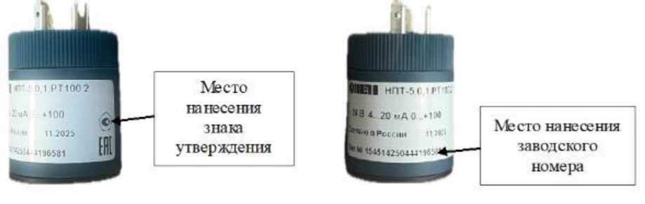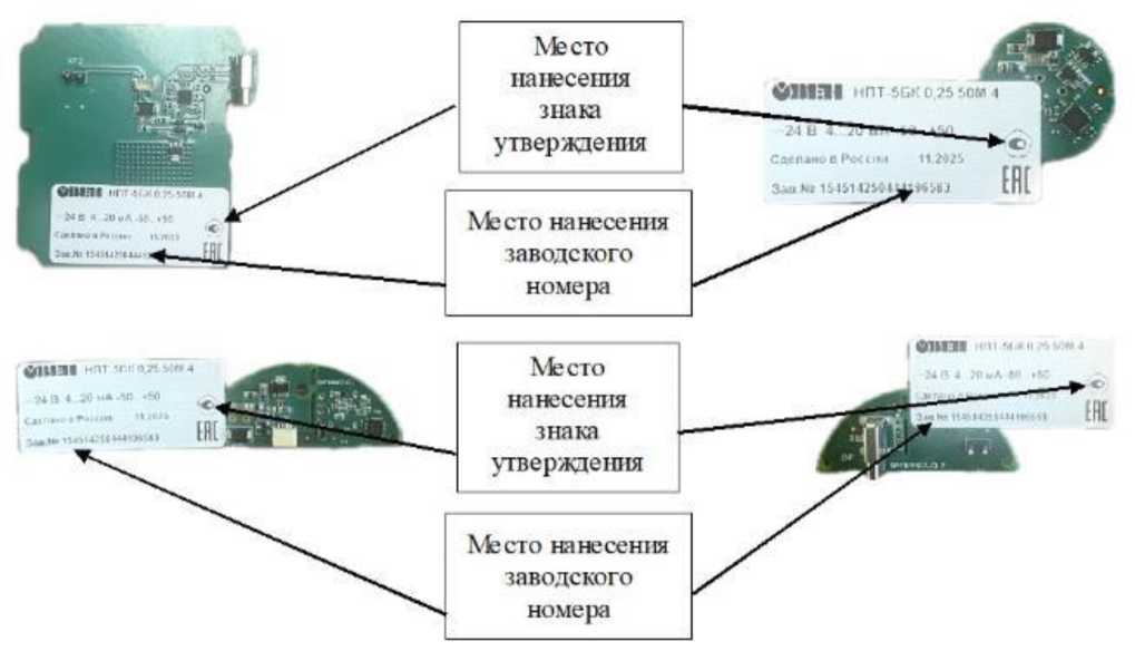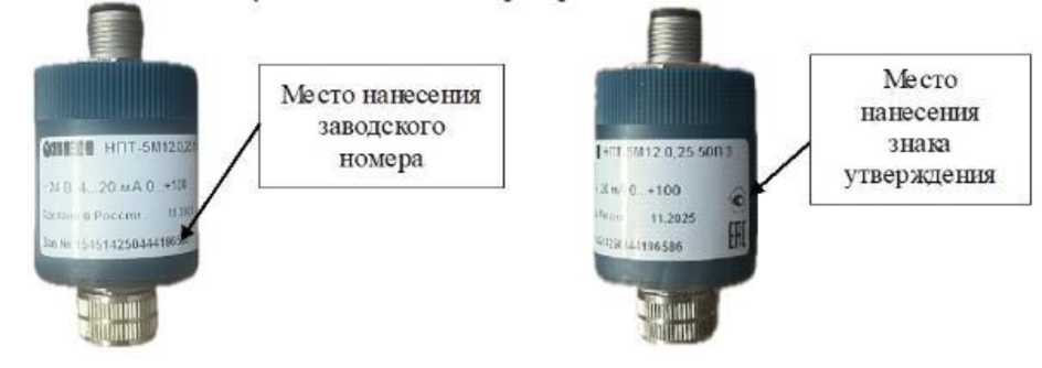 Заводской номер, состоящий из арабских цифр, наносятся типографским методом, методом гравировки, или другим методом, предусмотренным изготовителем. Заводской номер преобразователей НПТ-5 и НПТ-5М12 наносится на корпус, как показано на рисунках 2-3. Заводской номер преобразователей НПТ-5БК наносится на печатную плату, как показано на рисунке 4. Нанесение знака поверки на корпус преобразователя не предусмотрено конструкцией.