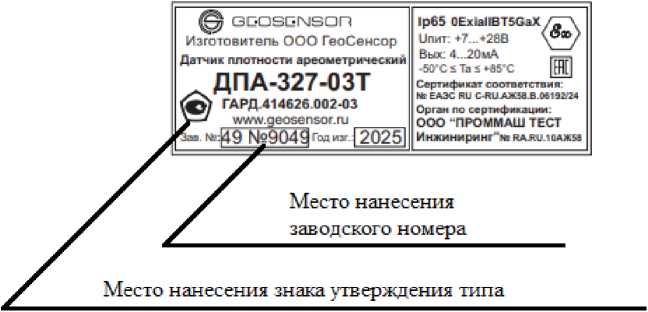 Заводской номер в виде цифрового обозначения, состоящий из арабских цифр, наносится на шильд корпуса ДПА (рисунок 2) методом металлографики. Следует учитывать, что на шильде приводится составной номер, первая часть которого является шифром типа прибора, а вторая -порядковым номером ДПА по системе нумерации предприятия-изготовителя. Также на шильде прибора указывается его краткое наименование, установленное внутренней конструкторской документацией.