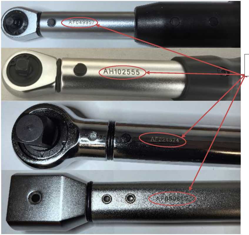 Заводской номер ключей в виде комбинации букв латинского алфавита и арабских цифр нанесен на корпус рядом с головкой методом гравировки. Также на корпусе ключа методом гравировки указаны его модификация, диапазон измерений крутящего момента силы и стрелкой обозначено направление приложения усилия при затяжке резьбовых соединений.