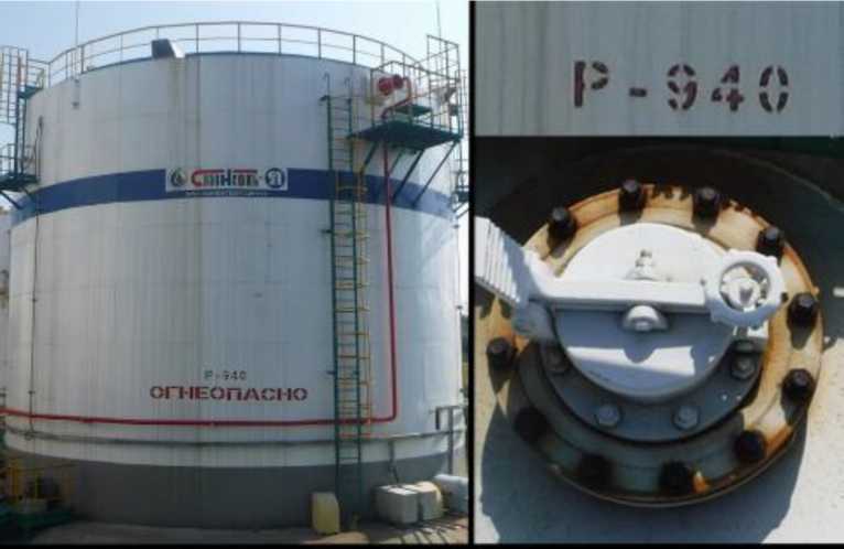Фотографии общего вида резервуара стального вертикального цилиндрического РВСП-2000, горловины замерного люка и заводского номера представлен на рисунке 1.