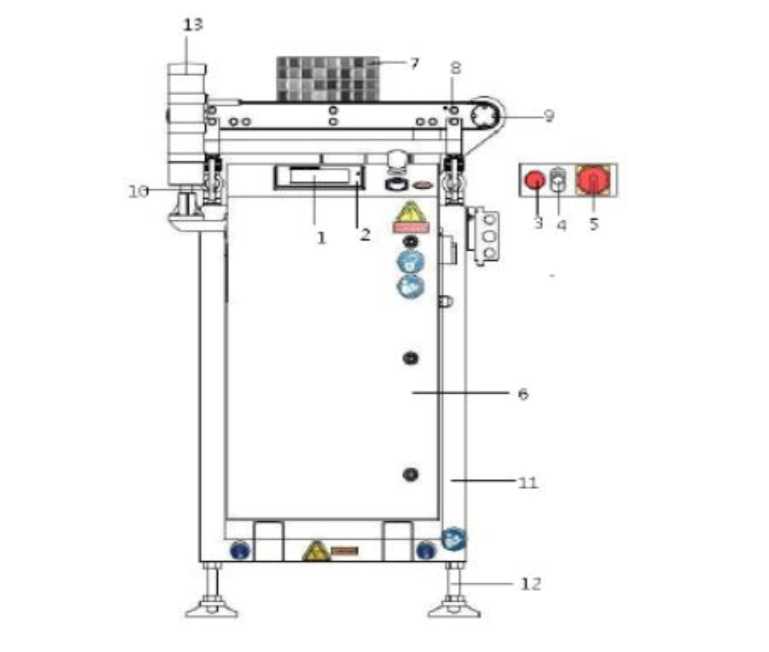 1.Экран дисплея 2. Терминал 3. Аварийная кнопка 4. Кнопка запуска/остановка конвейера 5.Переключатель электропитания 6. Шкаф управления 7.Продукция
